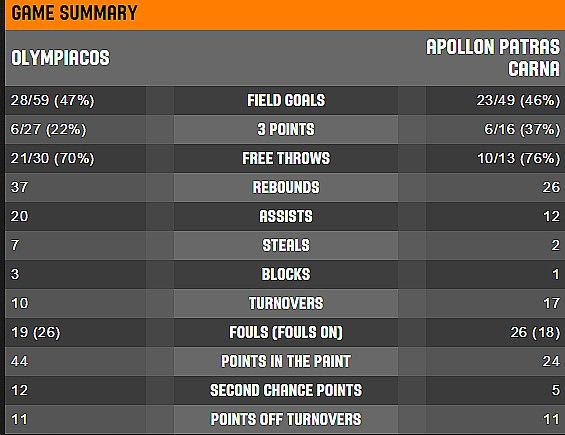 Ολυμπιακός: 7/9 βολές (77%), 8/11 δίποντα (72%), 0/9 τρίποντα.