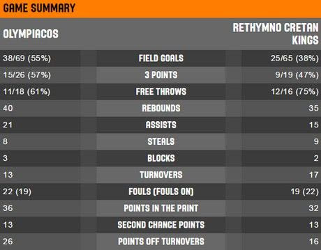 Ολυμπιακός: Παπαπέτρου 5, Μιλουτίνοφ 2, Μάντζαρης 3(1τρ, 4ασ), Λοτζέσκι 21(3/5τρ), Παπανικολάου 21(3/4τρ, 7ρ, 3ασ), Χάντερ 9(7ρ), Στρόμπερι 15(4/5τρ), Μουράτος, Αγραβάνης 3(1), Γουόρικ 10(6ρ), Χάκετ 7(1), Αθηναίου 6(2/2τρ)