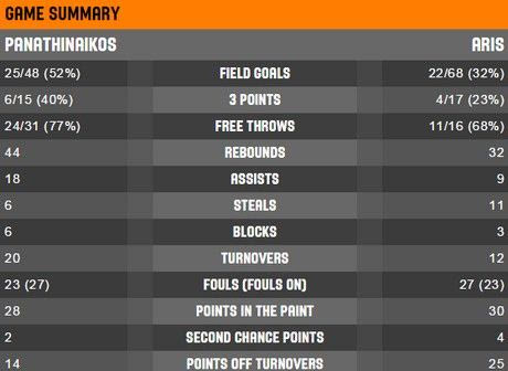 Παναθηναϊκός: 49 πόντοι, 15/17 βολές (88%), 11/18 δίποντα (61%), 4/9 τρίποντα (44%), 24 ριμπάουντ (22-2), 13 ασίστ, 8 λάθη, 4 κλεψίματα, 3 κοψίματα.