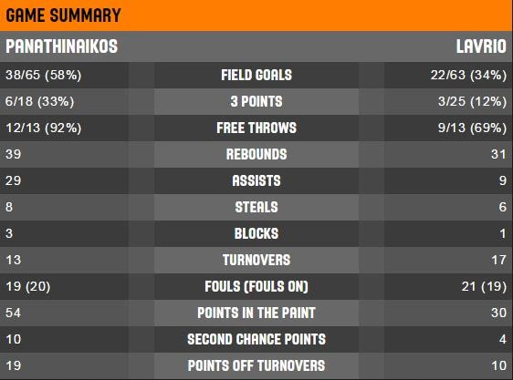 Για τον Παναθηναϊκό, ο αγώνας με το Λαύριο, ήταν “μία ακόμα ημέρα στη δουλειά”. Το “τριφύλλι” δεν κινδύνεψε σε κανένα σημείο του παιχνιδιού, ενώ το ευρύ σκορ έδωσε τη δυνατότητα στον Σάσα Τζόρτζεβιτς να δοκιμάσει διαφορετικά σχήματα και να ξεκουράσει βασικούς παίκτες. ‘Άξιο σχολιασμού το 67% στα σουτ εντός πεδιάς (23/34) για τους “πράσινους” στο πρώτο μέρος, αλλά και οι 29 ασίστ έναντι μόλις 9 του Λαυρίου. Πλέον, ο Παναθηναϊκός στρέφει την προσοχή του στο κρίσιμο παιχνίδι της Ευρωλίγκας με την Ουνικάχα Μάλαγα (03/03, 21:45).