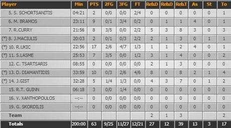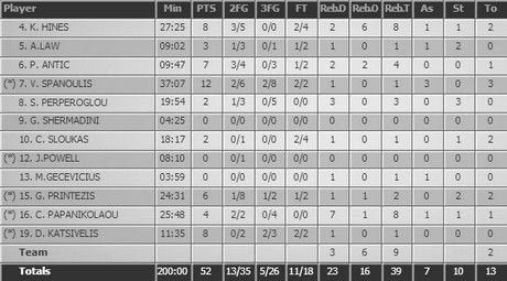 Tο λεγόμενο supporting cast του Ολυμπιακού δεν μπόρεσε να προσφέρει ουσιαστικές βοήθειες στον Σπανούλη. Σλούκας, Περπέρογλου, Πρίντεζης είχαν απόδοσης μέτρια έως κακή και ο αρχηγός έμεινε μόνος.