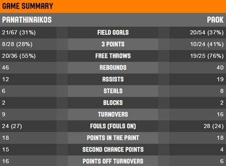 ΠΑΟΚ: 69 πόντοι, 19/25 βολές (76%), 10/30 δίποντα (30%), 10/24 τρίποντα (41%), 40 ριμπάουντ (34-6), 19 ασίστ, 16 λάθη, 8 κλεψίματα, 2 κοψίματα.