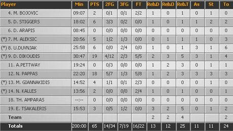Ο Ομπράντοβιτς, παρά την κακή εικόνα της ομάδας του, ήρεμος έδωσε επιθέσεις στον πιο φορμαρισμένο παίκτη της ομάδας του, τον Κώστα Καϊμακόγλου. Τον δικαίωσε, ενώ και ο Λόγκαν βοήθησε να καλυφθεί η (μία από τις σπάνιες φορές την τελευταία 10ετία) αρνητική εμφάνιση του Διαμαντίδη. Ο Καϊμακόγλου με ένα απίθανο τρίποντο από τα 10 μέτρα, έκλεισε το ημίχρονο 37-32.