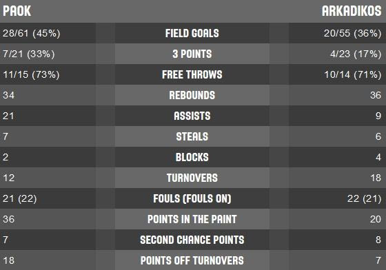 Ο ΠΑΟΚ έκανε εξαιρετικό τρίτο δεκάλεπτο με αποτέλεσμα να βάλει τις βάσεις για την νίκη. Μεγάλωσε το σερί νικών και παίρνει τα πάνω του. Ο Αρκαδικός ήταν αξιοπρεπέστατος μέχρι το πρώτο ημίχρονο. Μετά δεν μπορούσε να ακολουθήσει τον Δικέφαλο.