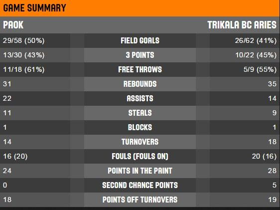 Ο ΠΑΟΚ τελείωσε το παιχνίδι με 11/18 βολές, 29/58 δίποντα και 13/39 τρίποντα ενώ τα Τρίκαλα με 5/9 βολές, 26/62 δίποντα και 10/22 τρίποντα.