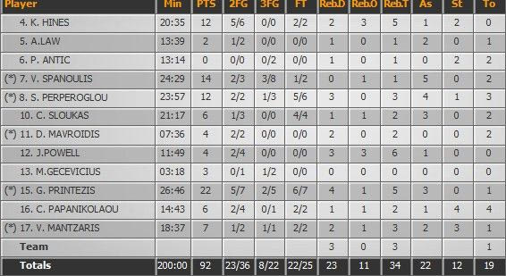 Ο Ολυμπιακός έψαξε την ευκαιρία να εντάξει ομαλά στο σύνολό τον Πάουελ ο οποίος πήρε 12 λεπτά και χάρισε 4 πόντους και 6 ριμπάουντ. Ισως να ήταν το καλύτερο νέο για τον Γιώργο Μπαρτζώκα. Το Περιστέρι κέρδισε τις εντυπώσεις με το μαχητικό πνεύμα του και τη νοοτροπία των παικτών του.