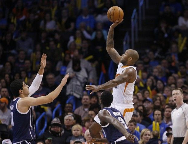 Phoenix Suns forward P.J. Tucker, right, shoots in front of Oklahoma City Thunder center Enes Kanter, left, and guard Anthony Morrow (2) in the second quarter of an NBA basketball game in Oklahoma City, Thursday, Dec. 31, 2015. (AP Photo/Sue Ogrocki) AP