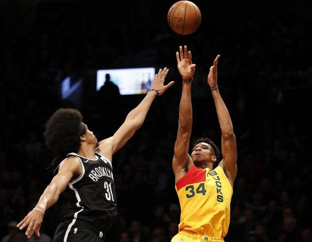 Milwaukee Bucks forward Giannis Antetokounmpo (34) attempts a three-point basket against Brooklyn Nets center Jarrett Allen (31) during an NBA basketball game, Monday, April 1, 2019, in New York. (AP Photo/Michael Owens) AP Photo/Michael Owens