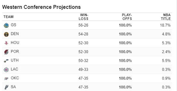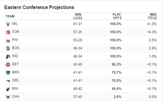 Αποδεχόμενοι την εγκυρότητα του εν λόγω συστήματος, οι Μπακς δίδονται το απόλυτο φαβορί για την κατάκτηση του τίτλου συγκεντρώνοντας ποσοστό 41.2%. Αυτοδυναμία! Έναντι του μόλις του 18.7% που συνοδεύει τους πρωταθλητές Γουόριορς, οι οποίοι θα πρέπει πρώτα να ξεπαστρέψουν τρεις ομάδες της σκληρής Δύσης προτού φτάσουν να διεκδικήσουν εκ νέου τη διατήρηση των κεκτημένων. Η μόνη ομάδα από τις υπόλοιπες που συγκεντρώνει επίσης διψήφιο ποσοστό είναι οι Τορόντο Ράπτορς του Λέοναρντ. (14.3%). Ως εκεί, από ‘κει και κάτω το… έρεβος.