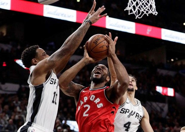 Toronto Raptors forward Kawhi Leonard (2) is blocked as he drives to the basket against San Antonio Spurs guard DeMar DeRozan (10) and guard Derrick White (4) during the first half of an NBA basketball game, Thursday, Jan. 3, 2019, in San Antonio. (AP Photo/Eric Gay) AP