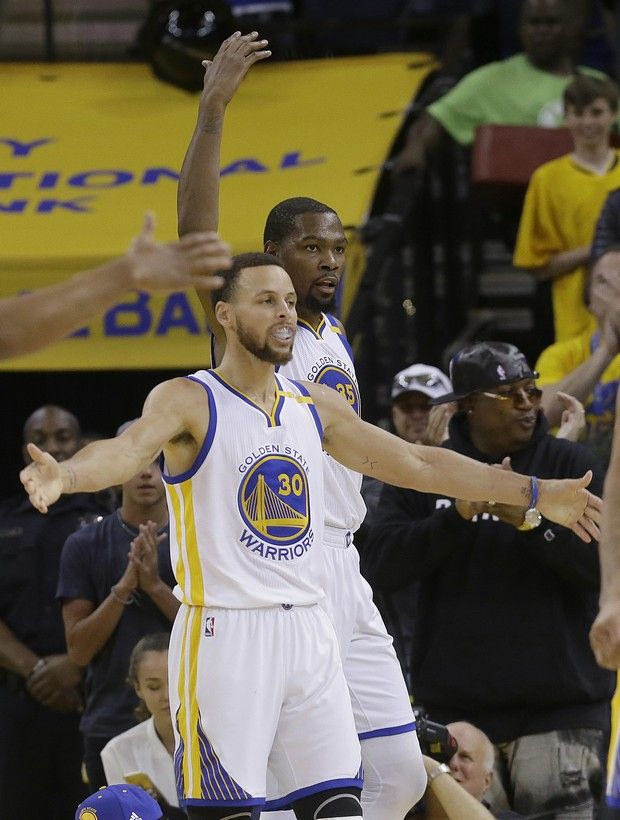 Golden State Warriors guard Stephen Curry (30) and forward Kevin Durant celebrate during the second half of Game 1 of a first-round NBA basketball playoff series against the Portland Trail Blazers in Oakland, Calif., Sunday, April 16, 2017. The Warriors won 121-109. (AP Photo/Jeff Chiu) AP