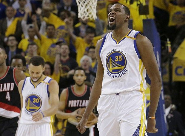 Golden State Warriors forward Kevin Durant (35) reacts after scoring against the Portland Trail Blazers during the second half of Game 1 of a first-round NBA basketball playoff series in Oakland, Calif., Sunday, April 16, 2017. The Warriors won 121-109. (AP Photo/Jeff Chiu) AP