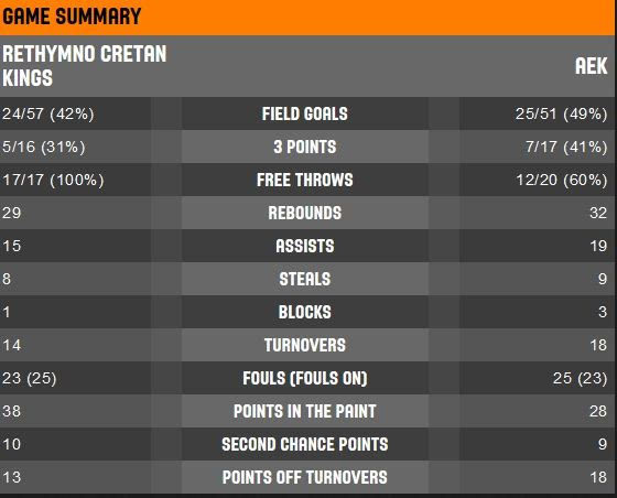 Ρέθυμνο (Σκουρτόπουλος): Ντελινινκάιτις (3 λάθη), Σχίζας 5, Μάντεν 16 (8 ριμπ., 6 ασίστ), Σάφτενααρ 14 (5 ριμπ.), Τσακαλέρης, Χάροου 10 (4 ασίστ), Στόουν 13 (6 ριμπ.), Κάρτερ 12, Θεοδωρίδης.