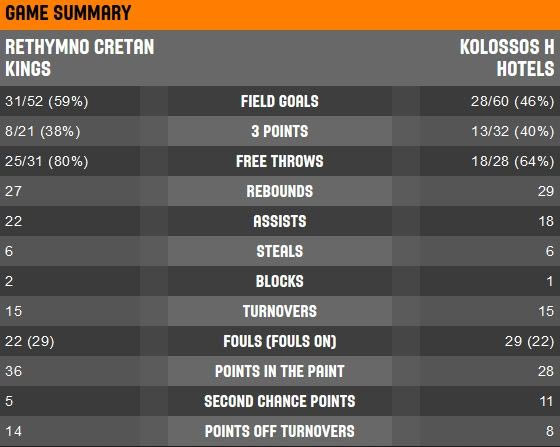 Σε ματς στο οποίο είχαν πρωταγωνιστικό ρόλο στην επίθεση, το Ρέθυμνο φυσιολογικά πήρε το ματς φτάνοντας τους 95 πόντους. Οι Κρητικοί είχαν συνολικά καλύτερες επιθετικές επιλογές και πήραν διαφορά σε πολύ κρίσιμο χρονικό σημείο του αγώνα.