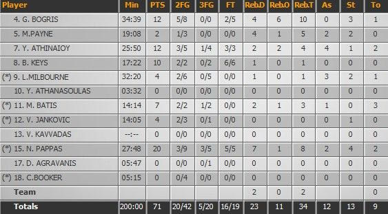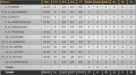 Πρώτοι σκόρερ είναι οι Πέτγουεϊ και Μπόγρης με 10 πόντους.