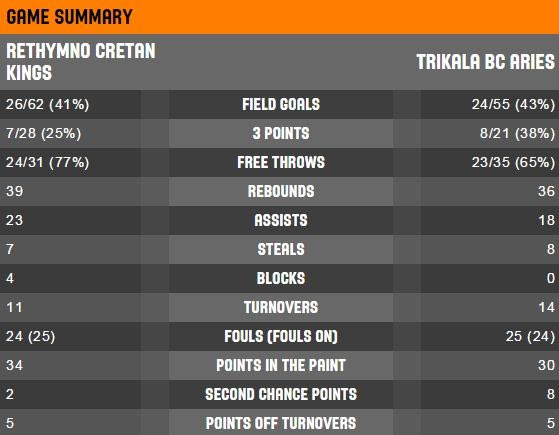 Τρίκαλα (Φλεβαράκης): Κάντουγκαν 5 (1), Ντάουελ 12 (2), Τσιάρας 7 (3), Κόντζερ18 (1), Τιγκ 9, Σόκο 8, Τσιλούλης, Καραθανάσης 2, Καλλές 4, Ρόμπινσον 14 (1), Καλογιαννίδης, Βαρυτιμιάδης.