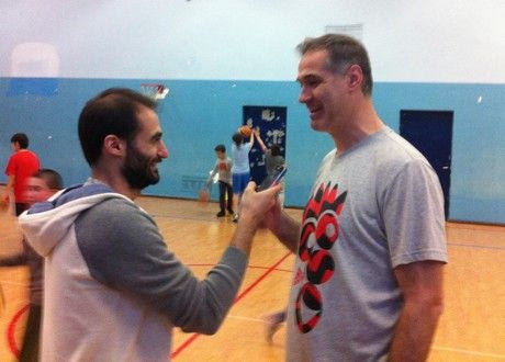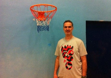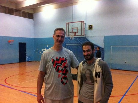 Δεν είναι τυχαίο ότι το μεταξύ μας ραντεβού κανονίστηκε σ’ ένα κλειστό γήπεδο του Παγκρατίου με δεκάδες πιτσιρίκια να τον περιτριγυρίζουν.