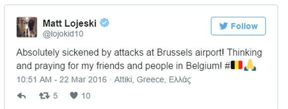 “Έχω αρρωστήσει από τις επιθέσεις στο αεροδρόμιο των Βρυξελλών. Σκέφτομαι και προσεύχομαι για τους φίλους μου και τους ανθρώπους στο Βέλγιο”,ανέφερε ο Λοτζέσκι.