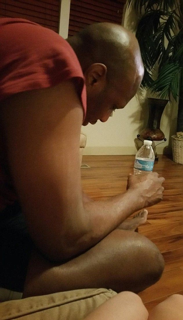 Στην πρώτη φαίνεται ο Όντομ να έχει ακόμη τις αισθήσεις του, αλλά να είναι ζαλισμένος κρατώντας ένα μπουκάλι νερό στο χέρι του. Τα μάτια του είναι μισοανοιχτά, ενώ μπορεί να κανείς να διακρίνει και δύο γυναικεία πόδια δίπλα του. Αυτή η φωτογραφία τραβήχτηκε περίπου 18 ώρες πριν ο Όντομ βρεθεί αναίσθητος.