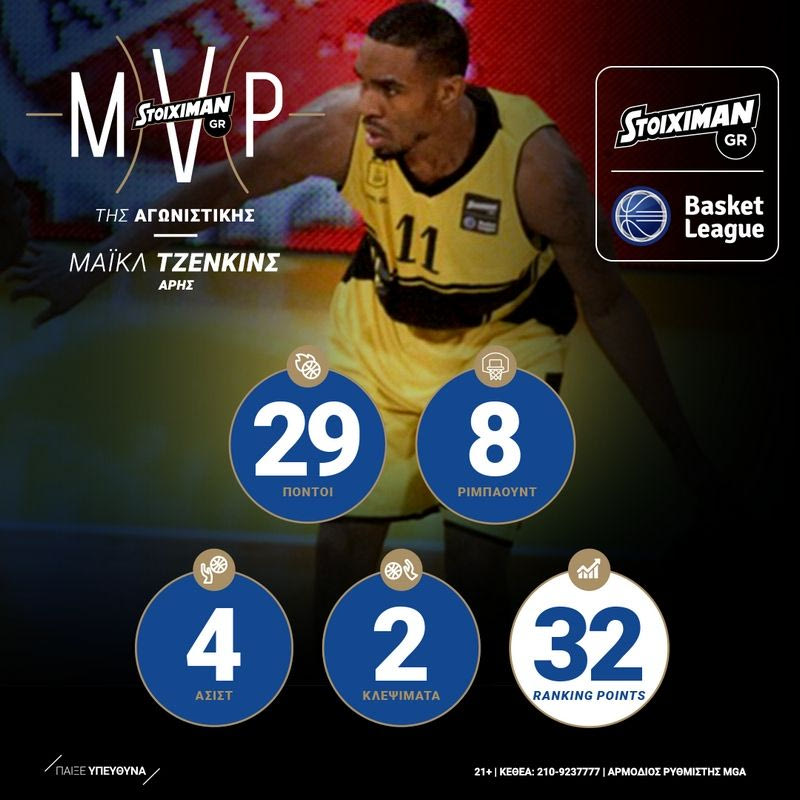 Ο Μάικλ Τζένκινς του Άρη αναδείχθηκε Stoiximan.gr MVP της τρίτης αγωνιστικής της Stoiximan.gr Basket League.