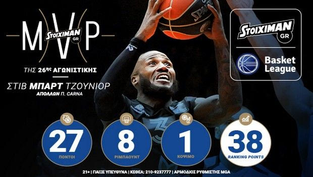 Ο Στιβ Μπαρτ Τζούνιορ αναδείχθηκε STOIXIMAN.GR MVP της τελευταίας (26ης) αγωνιστικής της κανονικής περιόδου της STOIXIMAN.GR Basket League.