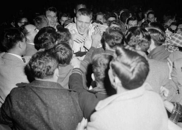 5. 1949, τελικοί πρωταθλήματος (5ο παιχνίδι) – Ο Τζορτζ Μάικαν αγωνίζεται με τραυματισμένο καρπό