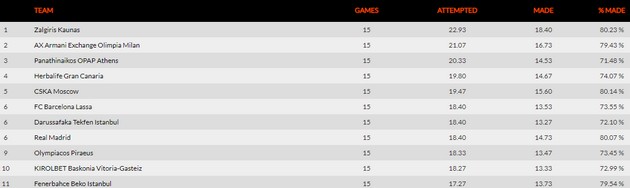 Ούτε η ΤΣΣΚΑ Μόσχας ούτε η Ρεάλ Μαδρίτης ούτε η Φενέρμπαχτσε έχουν κερδίσει ισάριθμες βολές με τη Ζαλγκίρις. Προφανώς η τακτική του Σαρούνας Γιασικεβίτσιους να περνάει η μπάλα στη ρακέτα φέρνει λιγότερα τρίποντα (μόλις 228, 64 κάτω από τη 15 Νταρουσάφακα) και περισσότερα κερδισμένα φάουλ (365 στο σύνολο, 24.33 ανά αγώνα). Ταυτόχρονα ωστόσο η διαφορά από τη δεύτερη Μιλάνο είναι 18 κερδισμένες βολές και με τον Παναθηναϊκό ΟΠΑΠ 39! Είναι ένας παράγοντας που παίκτες του Σάρας εκμεταλλεύονται δεόντως, αφού το 80.2% από τη γραμμή είναι το καλύτερο όλων.