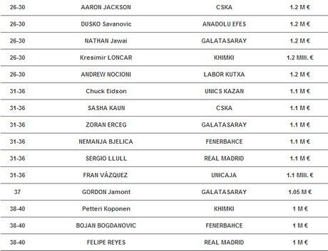 Ο Χουάν Κάρλος Ναβάρο έχει υπογράψει για 2.5 εκατ., ενώ ο Βασίλης Σπανούλης ακολουθεί με 2.3 εκατ., αφήνοντας πίσω για 100.000 τον Σόνι Ουίμς (ΤΣΣΚΑ Μόσχας) και για 200.000 ευρώ τον Μίλος Τεόντοσιτς και τον Βιτάλι Φριντζόν (επίσης της ΤΣΣΚΑ), οι οποίοι συμπληρώνουν την πρώτη 10άδα.