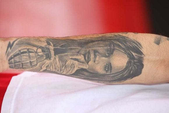 Και εδώ, όπως και στην περίπτωση των Πρίντεζη και Γκριν, έγινε αρκετή κουβέντα για το πόσα είναι τα τατουάζ και πως μετράει το καθένα. Τελικά, καταλήξαμε κάπου μεταξύ 15-20. Διαλέγετε και παίρνετε. Ακριβής αριθμός δεν προέκυψε. Ο Ιταλός γκαρντ έκανε το πρώτο του τατουάζ στα 15 του και αυτό που πάντα ξεχωρίζει, από όλα όσα έχει κάνει, είναι το όνομα της μητέρας του, Κάτια, που έχει στον καρπό του δεξιού του χεριού.
