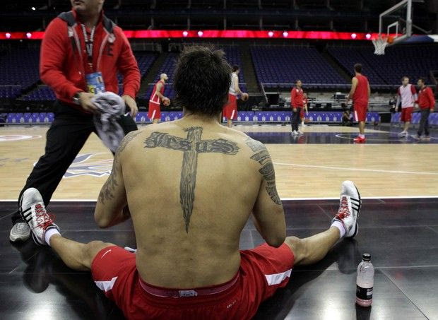 Και εδώ υπήρχε ανάλογο πρόβλημα με αυτό που αντιμετωπίσαμε με τον Γιώργο Πρίντεζη. Αλλά ο Αμερικανός ήταν πιο διαλλακτικός και αφού έκανε μια γρήγορη καταμέτρηση, εξήγησε γιατί είναι 15. Το πρώτο του το έκανε στα 18 και σχεδόν γέμισε τη μισή του πλάτη. Κάθε ένα από αυτό έχει το δικό του νόημα και κανένα δεν είναι απλό σχέδιο. Τα περισσότερα σχετίζονται με την οικογένεια του, μερικά εξ αυτών συμβολίζουν και του θυμίζουν την γειτονιά στην οποία μεγάλωσε, ένα όνομα ενός πολύ αγαπημένου του προσώπου που έφυγε πρόωρα από τη ζωή και ακόμη ένα που σχετίζεται με το μπάσκετ.