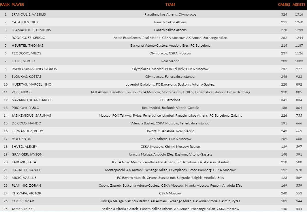 Φέτος έχει σπάσει όλα τα κοντέρ, αφού διαθέτει μέσο όρο 9,2 ασίστ ανά αγώνα, ξεπερνώντας ακόμα και την περσινή κορυφαία επίδοσή του με 8,7. Γι’ αυτόν τον λόγο, ο Καλάθης ευελπιστεί ότι θα φτάσει και τον μοναδικό παίκτη της Euroleague που έχει μοιράσει περισσότερες ασίστ, ο οποίος είναι αντίπαλός του κι εντός των συνόρων. Ο λόγος για τον Βασίλη Σπανούλη, που σε 324 αγώνες έχει 1.516 τελικές πάσες.