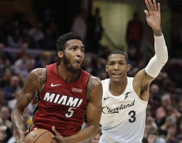 Miami Heat's Derrick Jones Jr. (5) drives past Cleveland Cavaliers' Patrick McCaw (3) in the second half of an NBA basketball game, Wednesday, Jan. 2, 2019, in Cleveland. Miami won 117-92. (AP Photo/Tony Dejak) AP