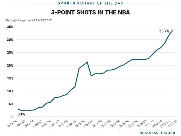 Κάθε οργανισμός στο ΝΒΑ έχει ολόκληρο επιτελείο ανθρώπων που ασχολούνται με τα στατιστικά. Όχι τα απλά, αλλά τα τέρμα εξελιγμένα. Η επανάσταση όμως, στο σκοράρισμα μπορεί να εξηγηθεί από μια εξίσωση, ικανή να αναλυθεί και από παιδί δημοτικού: οι τρεις πόντοι είναι περισσότεροι από τους δύο.