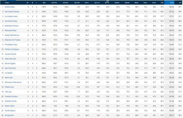Πλέον οι κορυφαίοι του χορού είναι οι Hawks (109 κατοχές ανά αγώνα, που τους δίνουν 107 πόντους κατά μ.ο, αλλά δέχονται 108) και αυτοί που αξιοποιούν πια καλύτερα τη φάση τους είναι οι Pelicans, των 107.33 κατοχών που γίνονται 122.2 πόντοι. Παρεμπιπτόντως, στην άμυνα δέχονται 109.4. Κάπου εδώ, θα ήταν χρήσιμο επίσης, να πούμε πως η καλύτερη αμυντική ομάδα, στο ξεκίνημα της σεζόν είναι οι Celtics (δεν επιτρέπουν περισσότερους από 96.6 πόντους ανά 101 κατοχές). Τη δεύτερη καλύτερη αμυντική επίδοση έχουν οι Nuggets των 103.10 κατοχών και των 101 πόντων, με το ΤΟΡ3 να συμπληρώνεται από τους Heat (102.38 και 101.5).