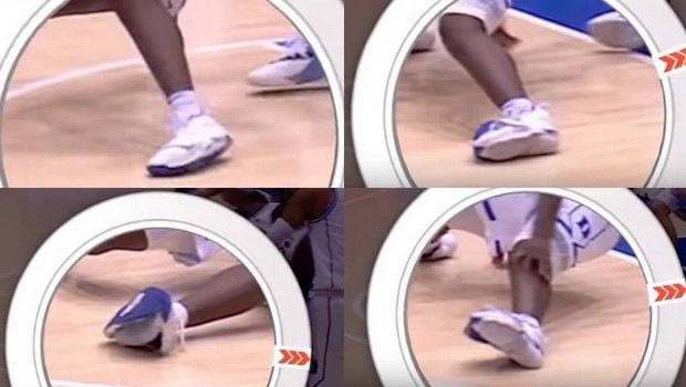 Όταν η κάμερα επέστρεψε πάνω του, φάνηκε ξεκάθαρα ότι όπως είχε πάρει την μπάλα περίπου στο ύψος της γραμμής των βολών -με την πλάτη στο καλάθι- και ετοιμαζόταν να κάνει την κίνηση του (να ‘κόψει’ προς το ‘πλεχτό’), έβαλε όλη τη δύναμη στο αριστερό πόδι και το παπούτσι διαλύθηκε στα εξ ων συνετέθη.