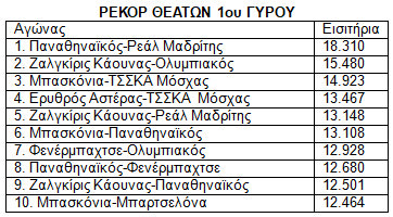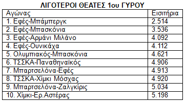 Να σημειωθεί ότι στη 10αδα των χειρότερων σε προσέλευση ματς είναι και το Ολυμπιακός-Μπασκόνια που όμως δεν έγινε στο ΣΕΦ αλλά στο Ηράκλειο (λόγω τιμωρίας) στην πρεμιέρα της διοργάνωσης.