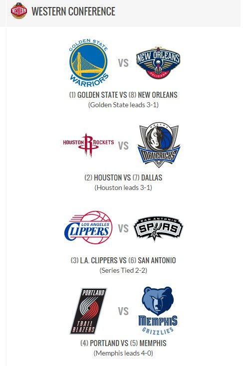 Στην Δύση οι Γκρίζλις σε περίπτωση που περάσουν το εμπόδιο των Κλίπερς, τότε θα βρουν απέναντί τους, τους Γκόλντεν Στέιτ Ουόριορς ή τους Νιου Όρλεανς Πέλικανς.