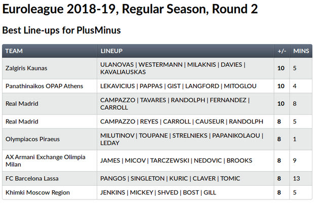 Στην πρεμιέρα, η Real Madrid ήταν η ομάδα που είχε τη μεγαλύτερη αποτελεσματικότητα συγκεκριμένης πεντάδας. Αυτή τη φορά δεν ήταν στο Νο1, αλλά είχε δυο συμμετοχές. Το ταίριασμα των Campazzo, Tavares, Randolph, Fernandez και Carroll έδωσε στη “βασίλισσα” +10 στο plus/minus (υπολογίζει τη συνολική επίδραση όλων, στην επιτυχία/αποτυχία της ομάδας τους, με το + να είναι θετικό πρόσημο και το – αρνητικό), στο διάστημα 8 λεπτών που βρέθηκαν αυτά τα παιδιά μαζί, στο 91-85 επί της Armani. Το επί μέρους σκορ ήταν 20-10. Oι Randolph και Tavares ήταν μέλη και της καλύτερης (σε plus/minus) πεντάδας της πρωταθλήτριας Ευρώπης, στην 1η αγωνιστική. Οπότε να ένα πρώτο συμπέρασμα.