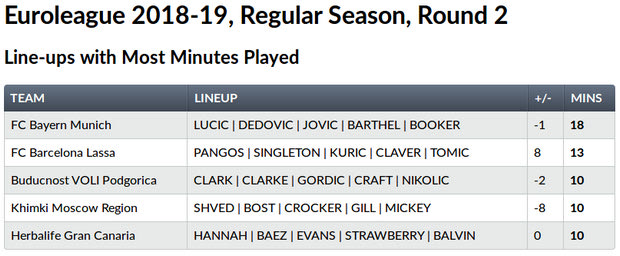 Το χειρότερο plus minus πέντε παικτών που έμειναν για ώρα, παρέα να εκπροσωπούν την ομάδα τους ανήκει στη Khimki, με τους Shved, Bost, Crocker, Gill και Mickey να συνεργάζονται για 10 λεπτά και να δίνουν -8. Στην πρεμιέρα είχαν συνυπάρξει για 16 λεπτά και είχαν για συντελεστή το +1. Να θυμίσουμε ότι η Khimki έχει ρεκόρ 0-2. Άρα κάτι παραμένει προς αναζήτηση.