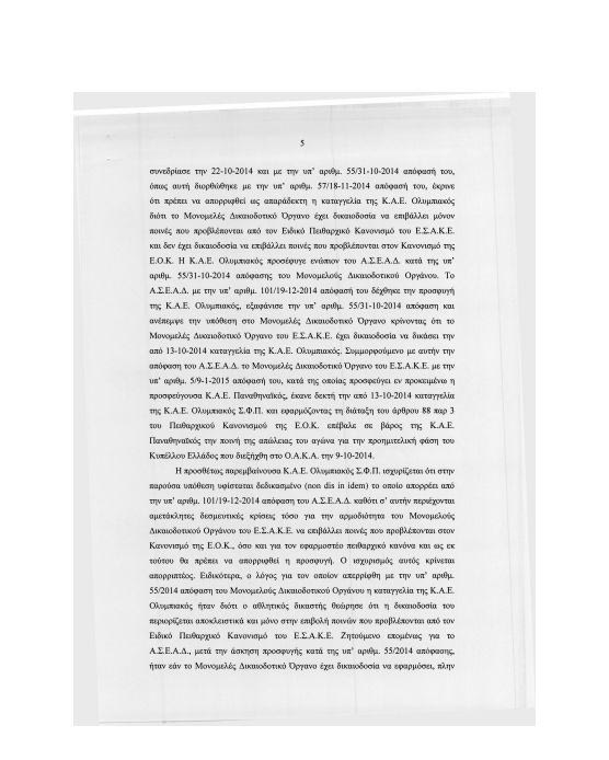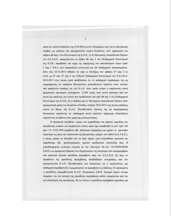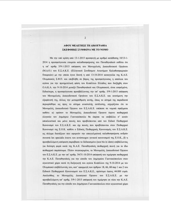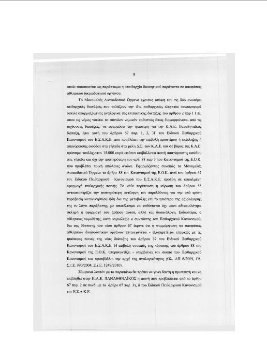 “Το Μονομελές Δικαιοδοτικό Όργανο έχοντας υπόψη του τις δύο ανωτέρω πειθαρχικές διατάξεις που κολάζουν την ίδια πειθαρχικώς ελεγκτέα συμπεριφορά όφειλε εφαρμοζόμενης αναλογικά της επιτακτικής διάταξης του άρθρου 2 παρ1 ΠΚ, όπου ως νόμος νοείται το σύνολον νομικόν καθεστώς όπως διαμορφώνεται από τις ισχύουσες διατάξεις, να εφαρμόσει την ηπιότερη για την Κ.Α.Ε. Παναθηναϊκός διάταξη, ήτοι αυτή του άρθρου 67 παρ.1, 2, 3Γ του Ειδικού Πειθαρχικού Κανονισμού του Ε.Σ.Α.Κ.Ε. που προβλέπει την επιβολή προστίμου ή επίπληξης ή απαγόρευσης εισόδου στα γήπεδα στα μέλη Δ.Σ. των Κ.Α.Ε. και σε βάρος της Κ.Α.Ε. πρόστιμο τουλάχιστον 15.000 ευρώ εφόσον επιβάλλεται ποινή απαγόρευσης εισόδου στα γήπεδα και όχι την αυστηρότερη του αρθ. 88 παρ3 του Κανονισμού της Ε.Ο.Κ. που προβλέπει ποινή απώλειας αγώνα.