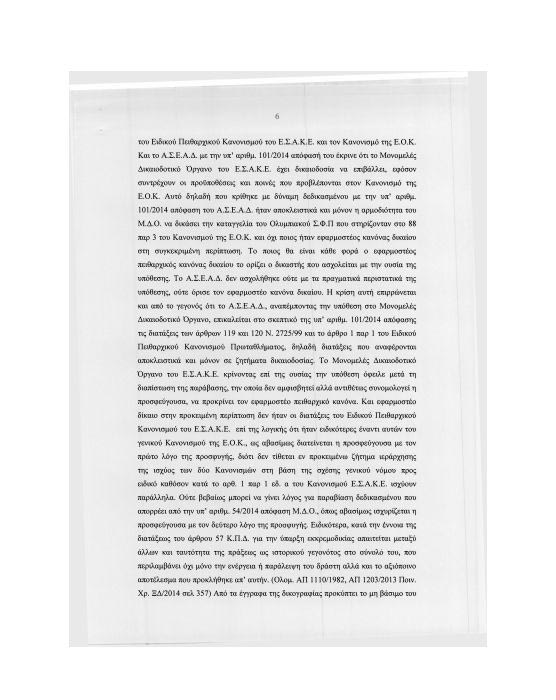 “Εφαρμόζοντας συνεπώς το Μονομελές Δικαιοδοτικό Όργανο το άρθρο 88 του Κανονισμού της Ε.Ο.Κ. αντί του άρθρου 67 του Ειδικού Πειθαρχικού Κανονισμού του Ε.Σ.Α.Κ.Ε. προέβη σε εσφαλμένη εφαρμογή πειθαρχικής ποινής. Σε κάθε περίπτωση η κύρωση του άρθρου 88 αντικατοπτρίζει την αυστηρότερη αντίληψη του παρελθόντος για την υπό κρίση παράβαση κατανικηθείσα ήδη δια της μεταβολής επί το ηπιότερο της αξιολόγησης της εν λόγω παράβασης, με αποτέλεσμα να καθίσταται όχι μόνο αδικαιολόγητα σκληρή η εφαρμογή του άρθρου αυτού, αλλά και δυσανάλογη.