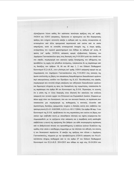 Στη σχετική απόφαση επισημαίνεται πως “εφόσον το Μονομελές Δικαιοδοτικό Όργανο έκρινε πειθαρχικά ελεγκτέο τον Δημήτριο Γιαννακόπουλο θα έπρεπε να επιβάλλει σ’ αυτόν αποκλειστικά και μόνο ποινές που προβλέπονται από τον Ειδικό Πειθαρχικό Κανονισμό του Ε.Σ.Α.Κ.Ε. και όχι ποινές που προβλέπονται στον Πειθαρχικό Κανονισμό της Ε.Ο.Κ. καθότι ο Ειδικός Πειθαρχικός Κανονισμός του Ε.Σ.Α.Κ.Ε. ως πλέγμα διατάξεων που αφορούν την επαγγελματική καλαθοσφαίριση ανδρών συνιστά lex specialis έναντι του αντίστοιχου γενικού κανονισμού της Ε.Ο.Κ.”.