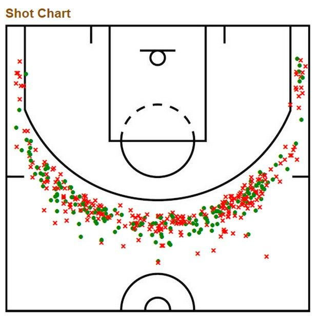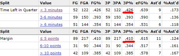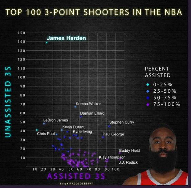 Το 39% είναι η μόλις έβδομη επίδοση μεταξύ των παικτών που έχουν τουλάχιστον 200 σουτ πίσω από τη γραμμή (Κάρι, Χιλντ, Μπαρνς, Ίρβινγκ, Γκριν, Λίλαρντ). Ταυτόχρονα όμως ο Χάρντεν είναι αυτός που αυξάνει την ευστοχία του στο φινάλε κάθε περιόδου, κυρίως δε στα τελευταία τρία λεπτά της, κι ενώ η διαφορά μεταξύ των δύο ομάδων είναι ίση ή μικρότερη των 5 πόντων.