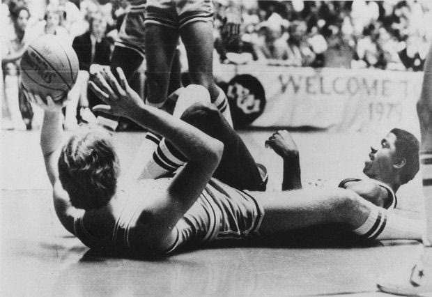 Indiana State's Larry Bird, left, lies on his back to toss the ball during a scramble with Earvin "Magic" Johnson, right, during NCAA Championship game in Salt Lake City, Utah, March 26, 1979. (AP Photo) ASSOCIATED PRESS