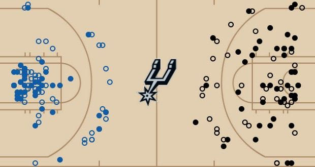 Με έντονο χρώμα τα εύστοχα, με το κενό τα άστοχα -οι μπλε είναι οι Νάγκετς και οι μαύροι οι Σπερς. Το Ντένβερ πήρε 72 πόντους από τη ρακέτα και το Σαν Αντόνιο 36 -μετά τα 26/46 σουτ από εκεί στο πέμπτο ματς (πηγή: ESPN).