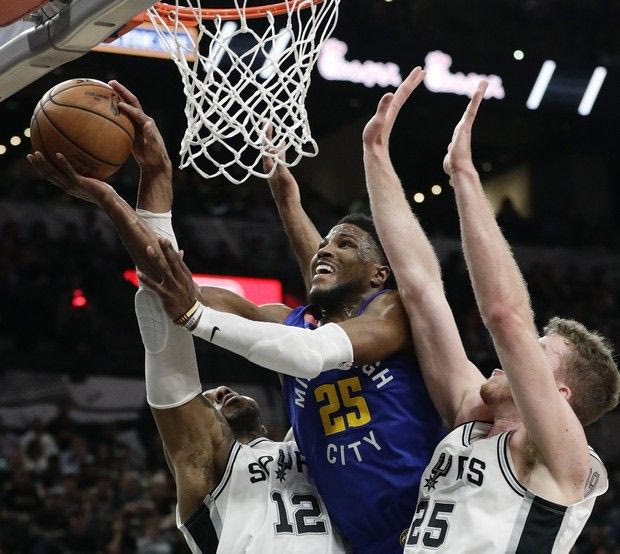 Denver Nuggets guard Malik Beasley (25) drives to the basket between San Antonio Spurs center LaMarcus Aldridge (12) and center Jakob Poeltl (25) during the first half of Game 6 of an NBA basketball playoff series, Thursday, April 25, 2019, in San Antonio. (AP Photo/Eric Gay) AP