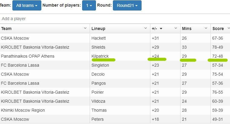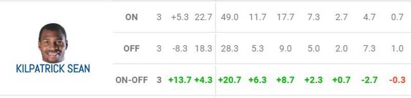 Αυτός πάντως που συνδύασε ιδανικότερα απ’ όλους τους άλλους τον πολύ χρόνο συμμετοχής με την προσφορά ήταν ο Σον Κιλπάτρικ. Ενόσω ο Αμερικάνος ήταν στο παρκέ, αυτά τα σχεδόν 28 λεπτά (παρά 2 δευτερόλεπτα) ο Παναθηναϊκός κατέγραψε +24 πόντους. Σκόραρε 72 και δέχθηκε μονάχα 48. Ήταν η τρίτη καλύτερη επίδοση των οκτώ αγώνων του διημέρου.