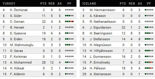 Χωρίς βαθμολογικό κίνητρο η Τουρκία, κινδύνευσε με ήττα από την Ισλανδία, έκλεισε πάντως με νίκη (111-102 στην παράταση) την παρουσία της στον Β' όμιλο και έστειλε στη δεύτερη θέση την Ισπανία. Με τη Γαλλία ούτως ή άλλως οι γείτονες του Αταμάν.