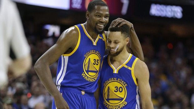 Golden State Warriors' Kevin Durant (35) hugs teammate Stephen Curry (30) during the first half of Game 4 of basketball's NBA Finals against the Cleveland Cavaliers in Cleveland, Friday, June 9, 2017. (AP Photo/Tony Dejak) AP