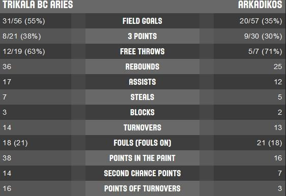 ΤΡΙΚΑΛΑ (Φλεβαράκης): Καντούγκαν 15 (1), Ντάουελ 5 (1), Τσιάρας 3, Κόντζερ 25 (3), Τιγκ 5, Σόκο 16 (1), Τσιλούλης, Καραθανάσης, Καλλές 2, Ρόμπινσον 11 (2), Βαρυτιμιάδης.